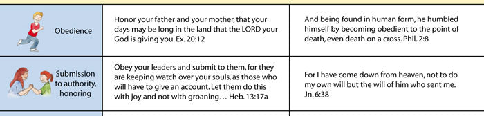 The left-hand column lists good character qualities, with cartoon drawings. The center column quotes Scripture verses that tell how God blesses us when these qualities are present in our lives. The right-hand column gives verses illustrating how Jesus exemplifies this quality.