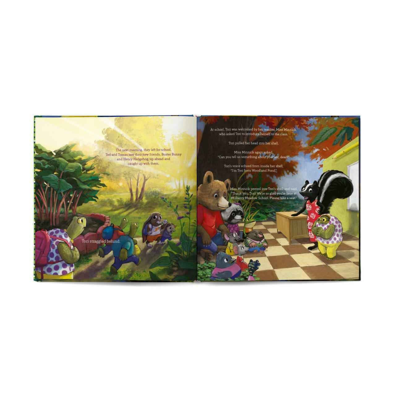 Tori the turtle feels all alone. She has just moved to a new pond with her family and it seems like everyone has a friend at her new school except for her. When her teacher, Miss Minnick, notices Tori feels alone, she helps her remember Jesus is always her friend and encourages her not to be scared about meeting new people. When Tori finds another lonely classmate on the playground, she feels brave enough to come out of her shell and make a new friend.